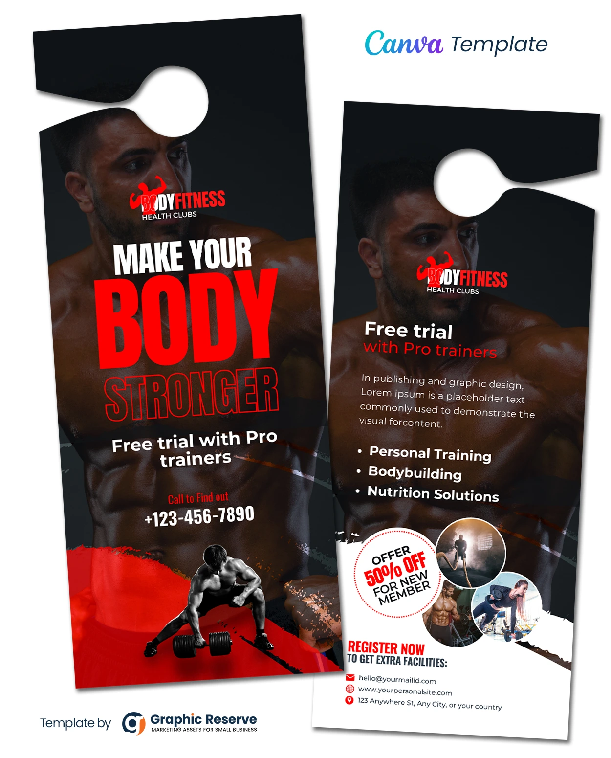 Ideal for gyms and fitness businesses looking to create an impactful marketing tool. Start customizing your door hanger for effective local advertising today!