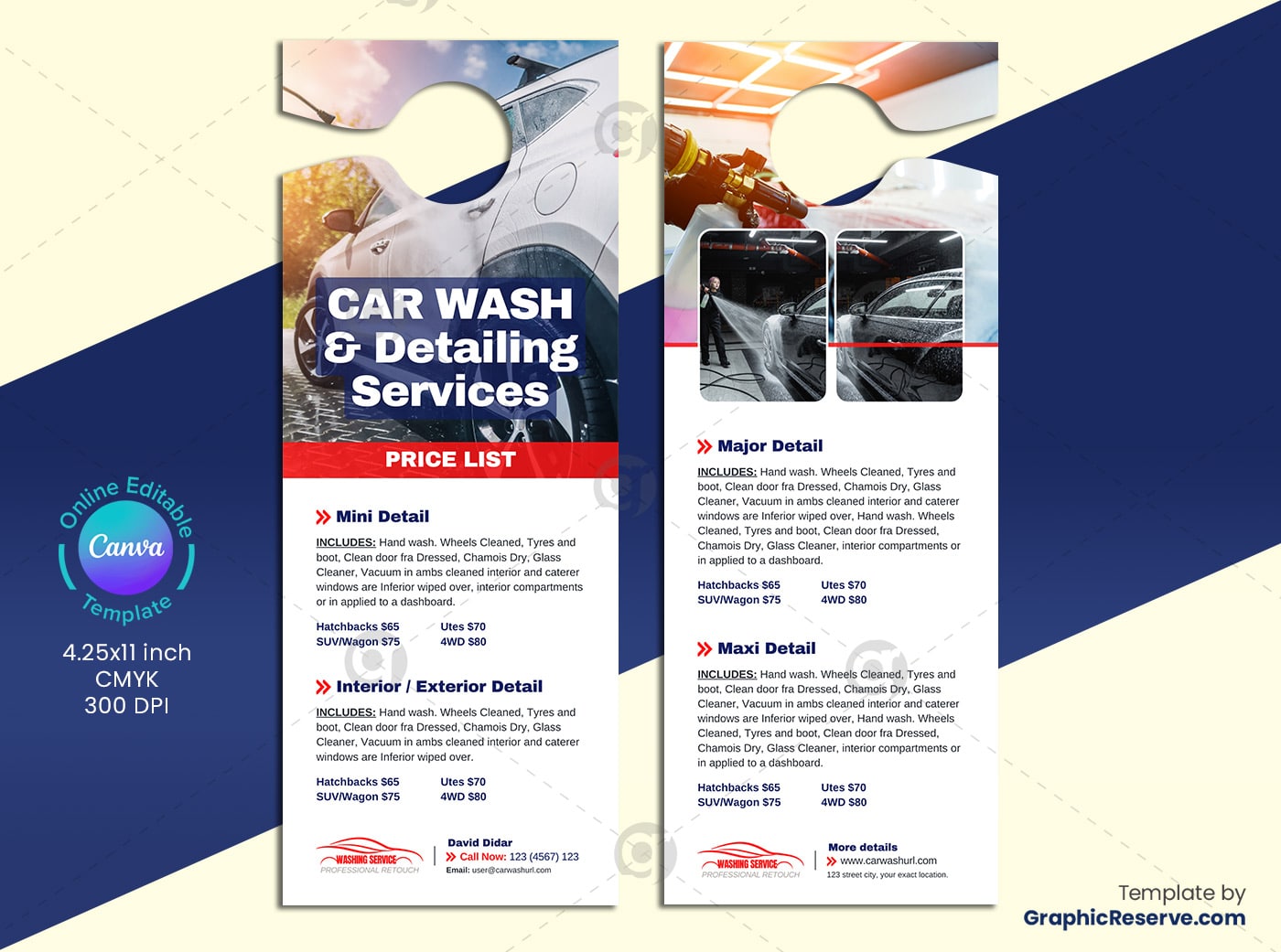 Car Wash Door Hanger Design Template. Automobile’s door hanger marketing template idea for car washes, garages, auto detailing services, valets, dealerships, repair shops, and other automotive businesses. Boost your company’s sales and attract new customers! all in an online easy customizable door hanger template canva.