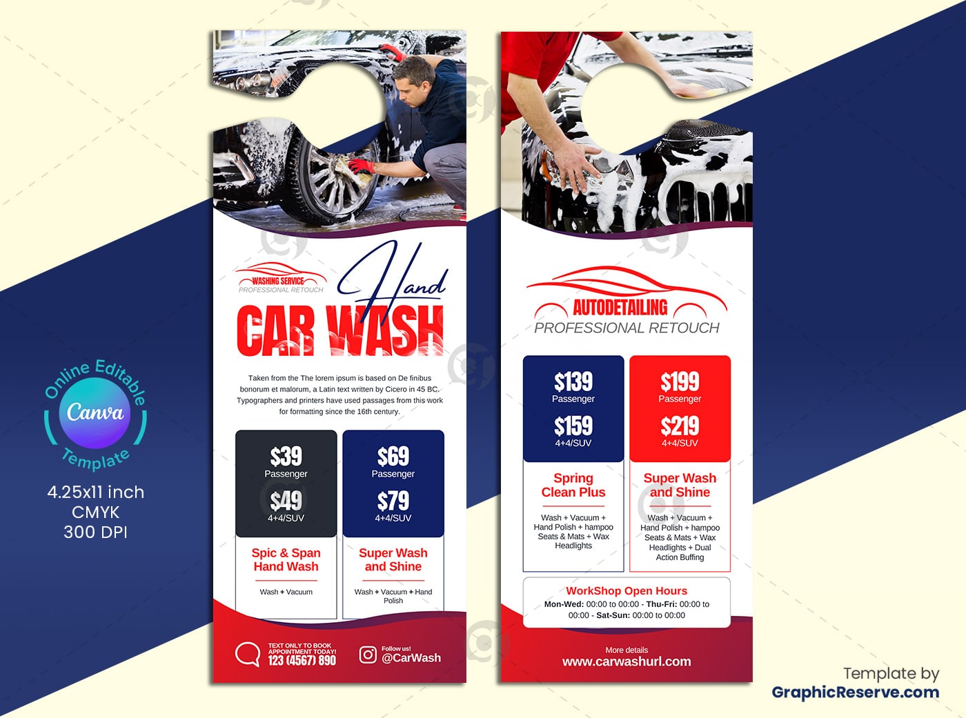 Car Wash Door Hanger Design Template. Automobile’s door hanger marketing template idea for car washes, garages, auto detailing services, valets, dealerships, repair shops, and other automotive businesses. Boost your company’s sales and attract new customers! all in an online easy customizable door hanger template canva.