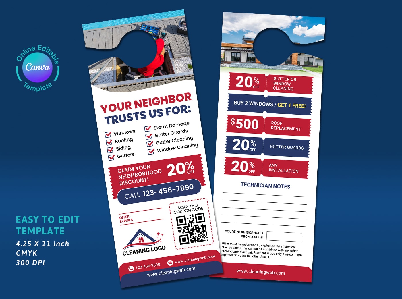 Cleaning Service Door Hanger Canva Template This template is designed for interior and exterior washing and cleaning services. You can definitely use these canva door hangers for any other services if you want. Fully editable, image/logo can be quickly added or replaced in Canva.