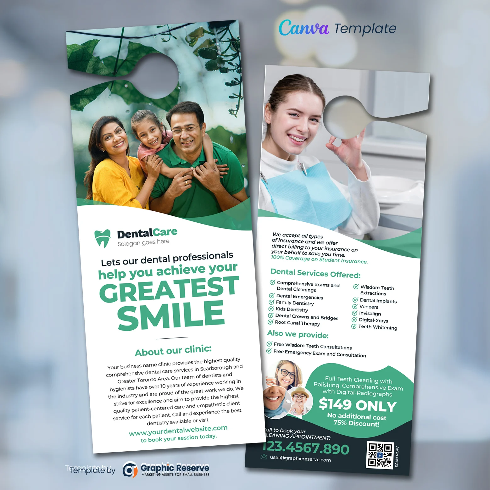 Dental Door Hanger Canva Template for Quality Dentistry Dental Service has no doubt the best marketing tool for quick success in products or services in the local area. This template can be used in any Business like medicine, doctor, health, health care, dentistry, etc. Door Hanger is the absolute best tool for businesses and businesses that open a new branch. Images, texts, and colors are fully editable, You can edit them quickly and easily in Canva.
