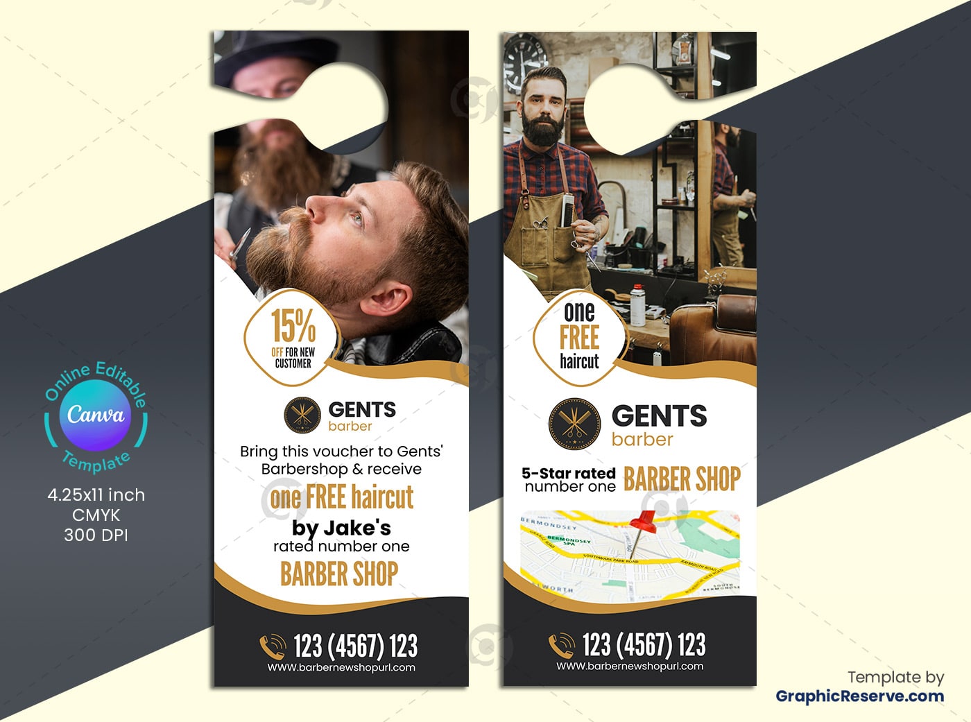 Editable Barber Shop Door Hanger Canva Template for Business Marketing