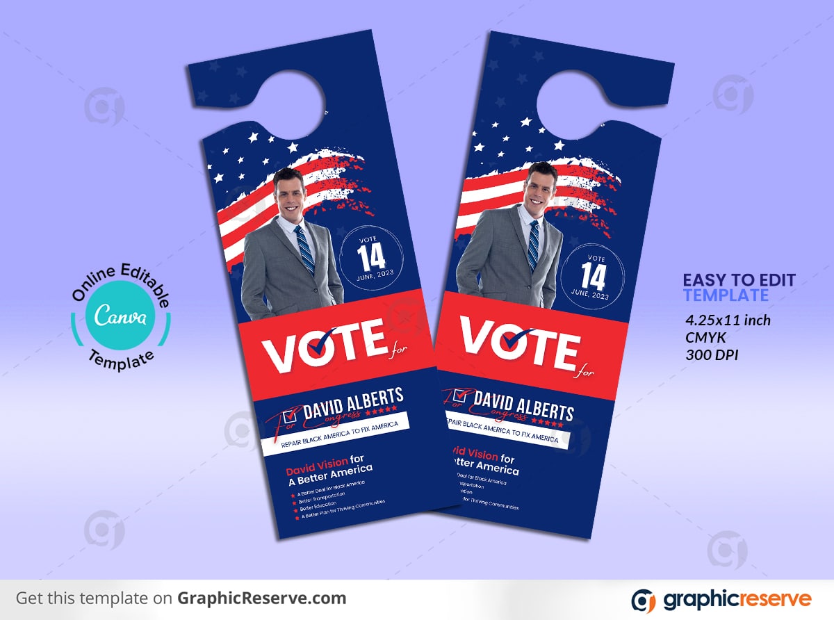 This Election Candidate Political Door Hanger Design Template is perfectly designed for Election campaigns and more. You can also use this template for various advertising purposes. Easily Editable for easy understanding. This template is well organized and structured. Images, texts, and colors are fully editable. You can edit them quickly and easily. Features: