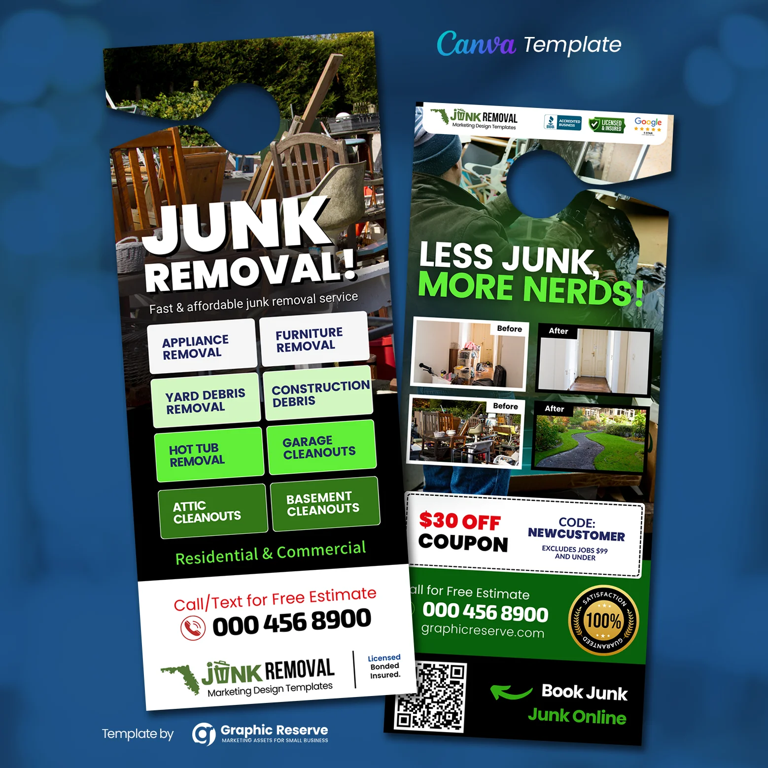 This junk removal advertising door hanger is fully editable in Canva — no design skills needed. Just drag, drop, update your info, and you’re ready to print or download.