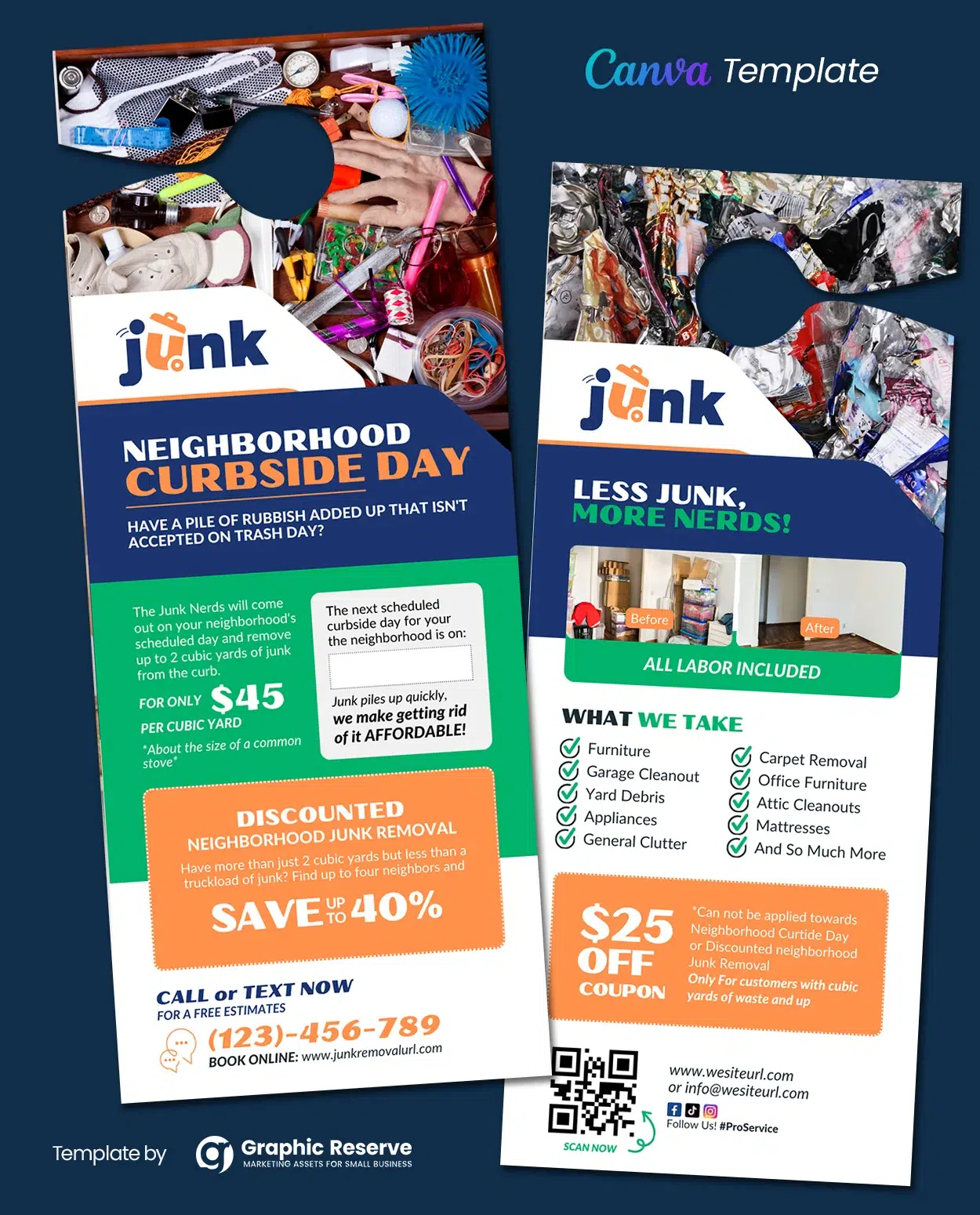 Junk Removal Services Door Hanger Canva Template This template is designed for interior and exterior junk removal and cleaning services. You can definitely use these canva door hangers for any other services if you want. Fully editable, image/logo can be quickly added or replaced in Canva