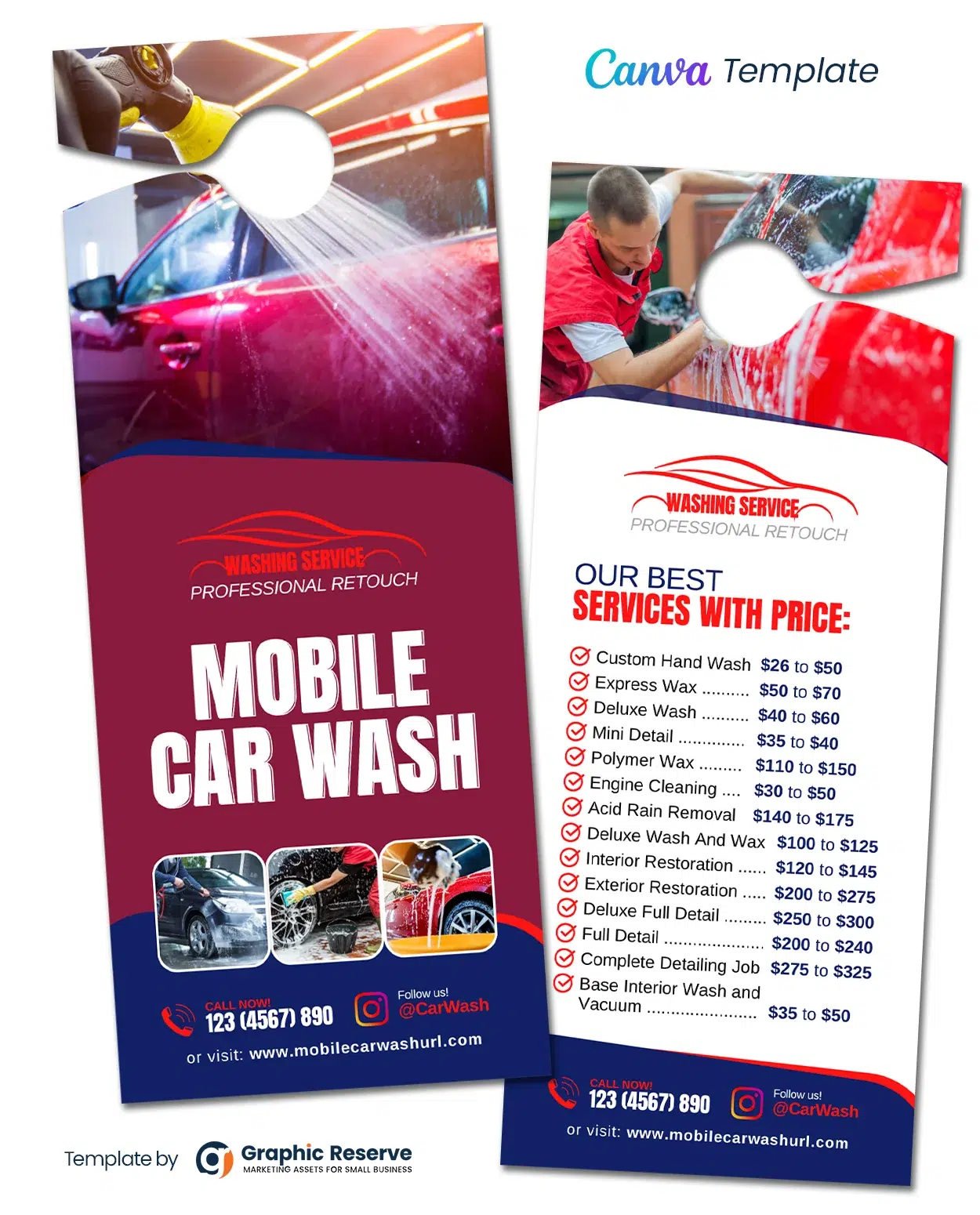 Mobile Car Wash Door Hanger Design Template. Automobile’s door hanger marketing template idea for car washes, garages, auto detailing services, valets, dealerships, repair shops, and other automotive businesses. Boost your company’s sales and attract new customers! all in an online easy customizable door hanger template canva.
