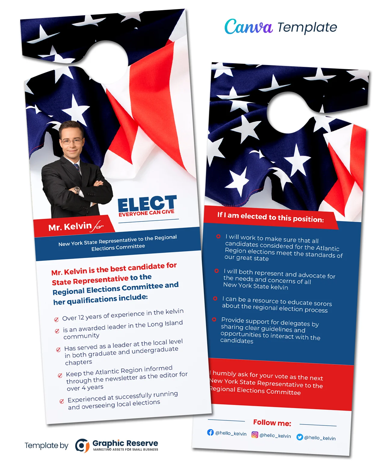 This Election Candidate Political Door Hanger Design Template is perfectly designed for Election campaigns and more. You can also use this template for various advertising purposes. Easily Editable for easy understanding. This door hanger template is well organized and structured. Images, texts, and colors are fully editable. You can edit them quickly and easily. Features: