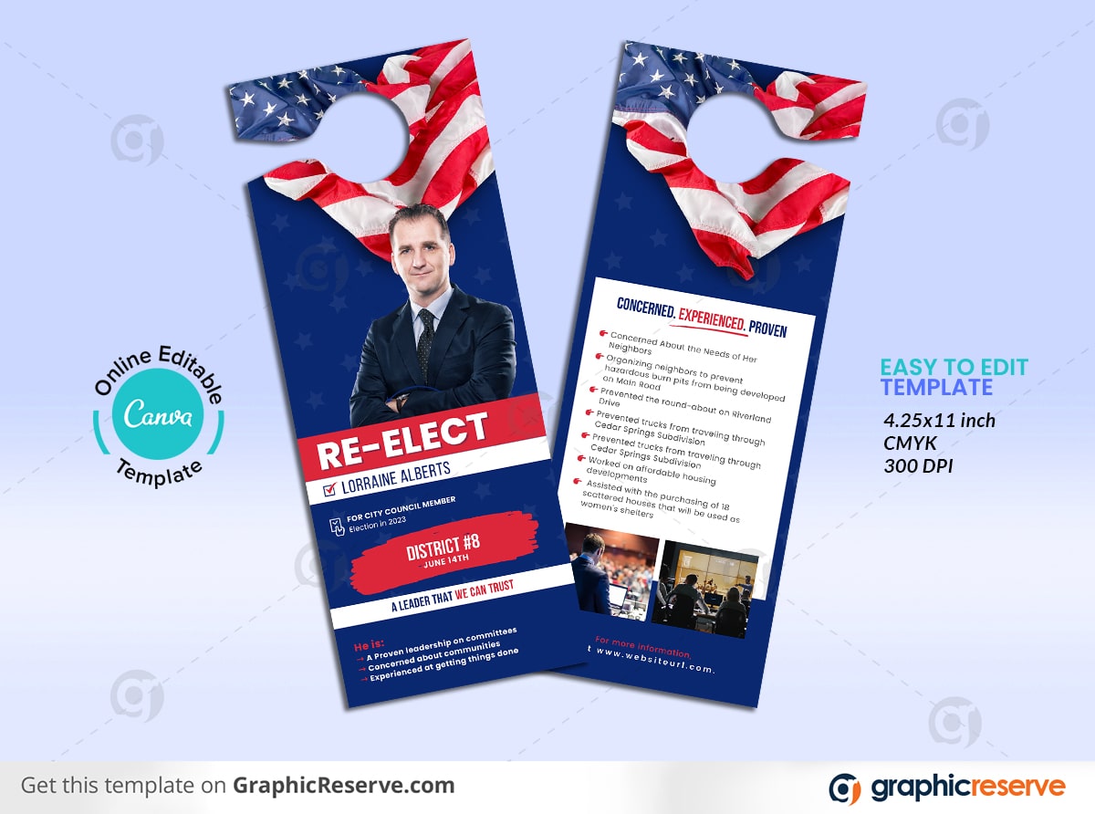 This Election Candidate Political Door Hanger Design Template canva is perfectly designed for Election campaigns and more. You can also use this template for various advertising purposes. Easily Editable for easy understanding. This template is well-organized and structured. Images, texts, and colors are fully editable. You can edit them quickly and easily. Features: