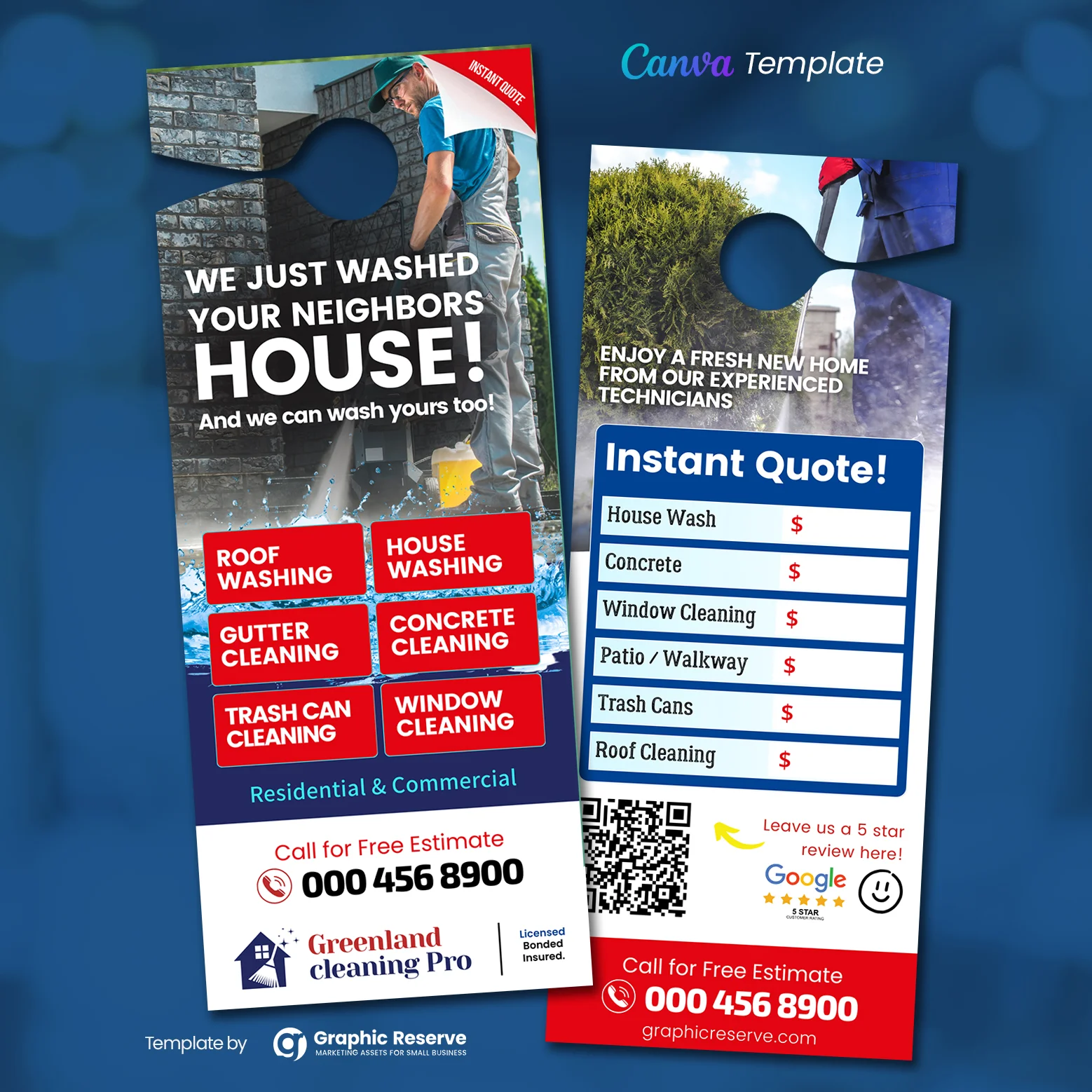 Easily promote your power washing services with this Instant Quote Door Hanger Template. Designed in Canva, it’s simple to customize with your pricing, services, and contact info—perfect for quick, local marketing!