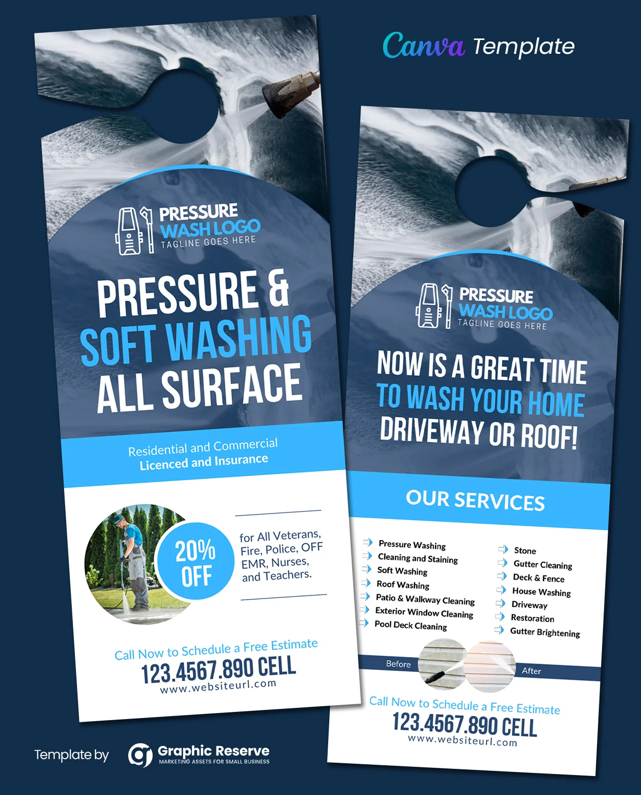 Download the Pressure/Power Washing Door Hanger Design Canva Template and start reaching new customers with a marketing tool that works!