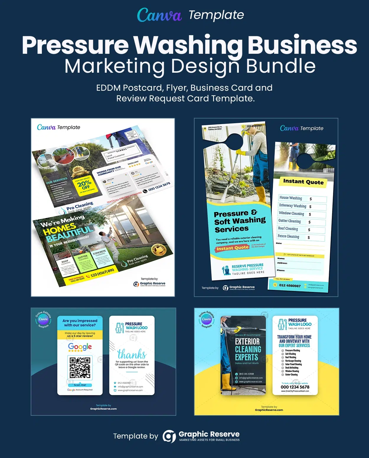 Make your pressure washing service the top choice in your area with our professionally designed Pressure Washing Business Marketing Bundle. This comprehensive marketing kit includes fully editable Canva templates created specifically for pressure and power washing professionals.