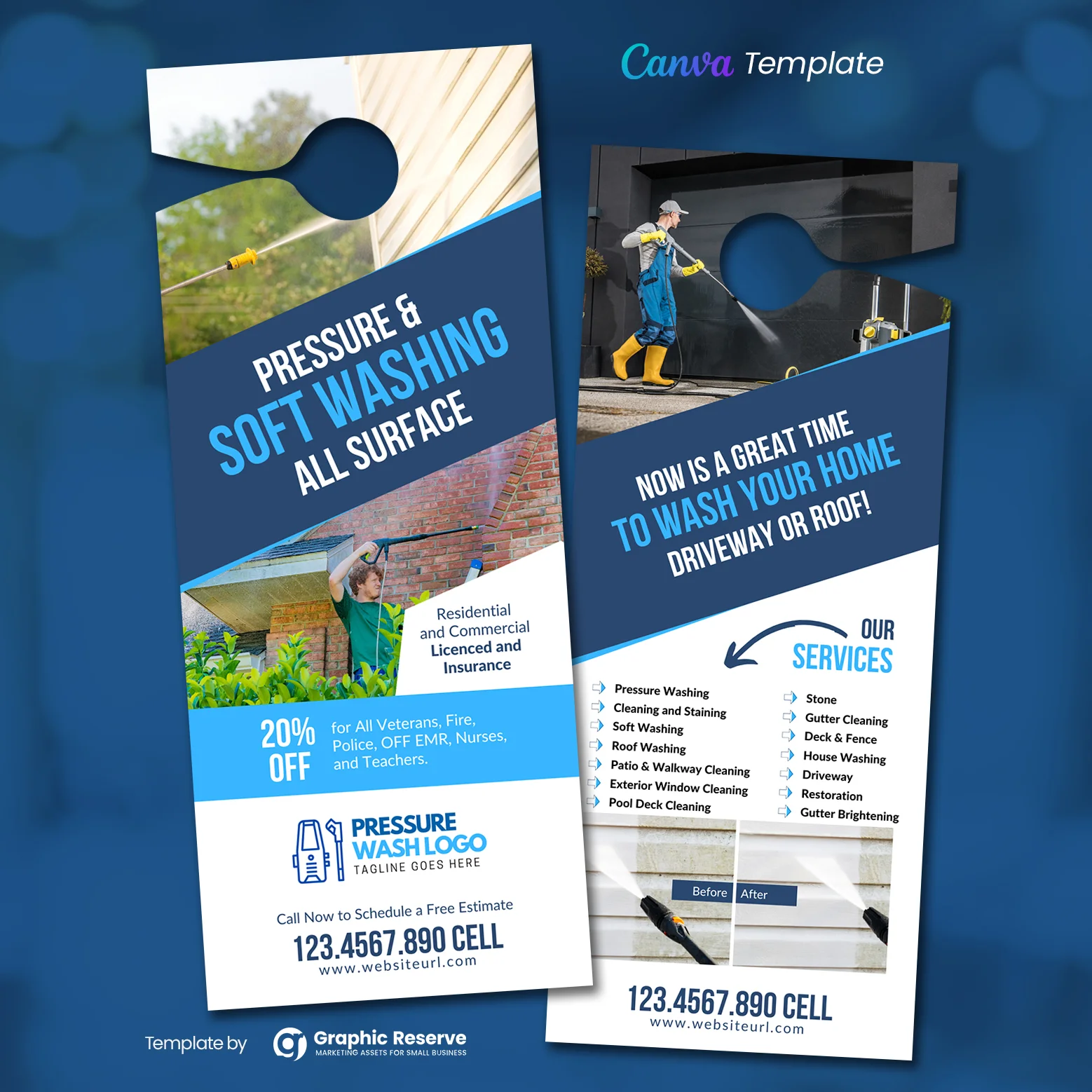 Pressure Washing Door Hanger Canva template This pressure washing door hanger template is specially designed for Cleaning and Washing Services, You can use this template for any other Services if you want. Fully editable, image/logo can be quickly added or replaced in Canva